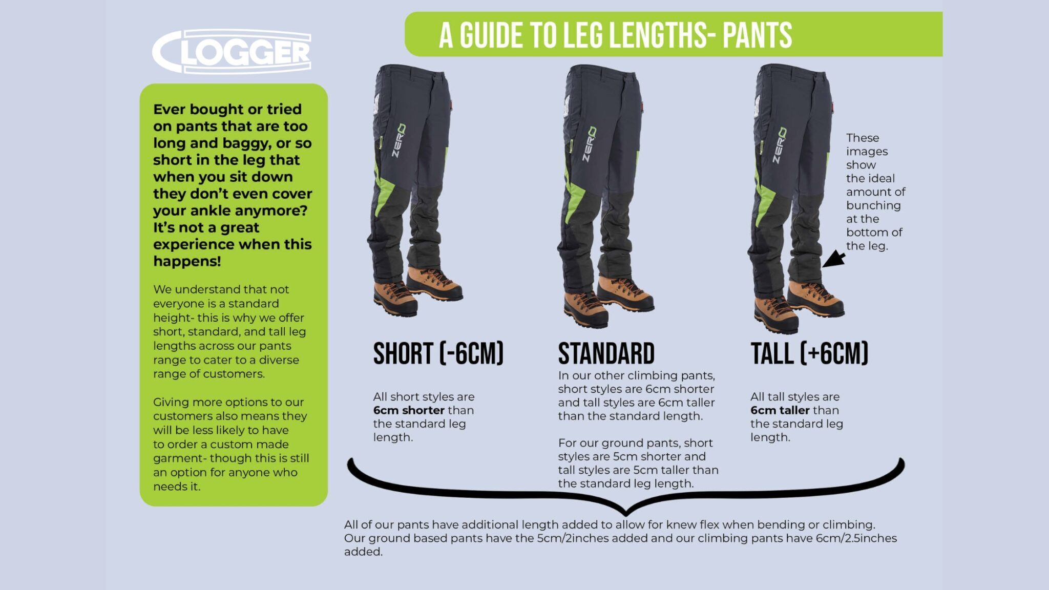 Finally, choosing the correct leg length for your chainsaw pants is crucial for both comfort and safety. It allows for unrestricted movement, ensuring you can work efficiently without any hindrance. Additionally, the correct leg length contributes to your overall comfort, preventing discomfort or exposure to the elements. The additional 6cm/2 inches of fabric in Clogger pants sets them apart by providing added protection when wearing a harness or actively moving, as is typical in the physical nature of chainsaw work.