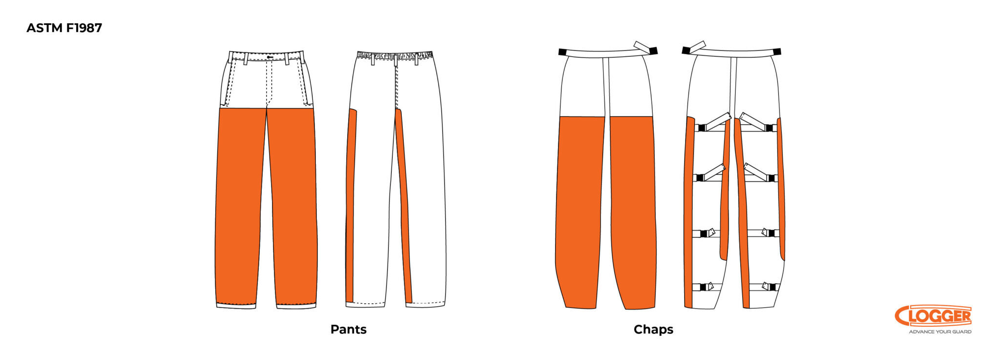 | Requirements for protective area | Trousers Design A: covers from 20cm above crotch to 5 cm above hem with an extra 5 cm of protection wrapping around on the left side of each leg. Chaps Design B: as for trousers Design A Trousers Design C: Front protection from 20 cm above the crutch to 5 cm above the hem with rear protection from 5 cm below the crutch to 5 cm above the hem. |