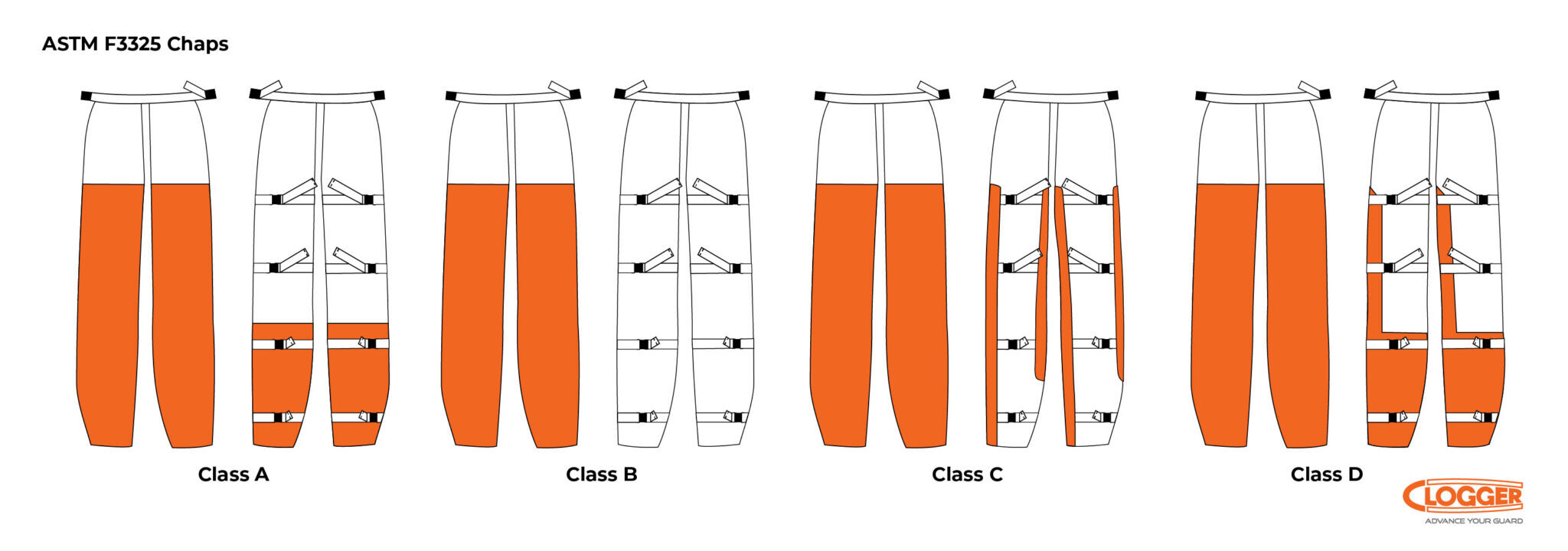 | Coverage area for pants and chaps | 4 coverage area options: Category A: front protection plus rear calf protection Category B: front protection only Category C: front protection plus extensions to the left of both legs Category D: same as for ‘C’ but with rear protection as well |