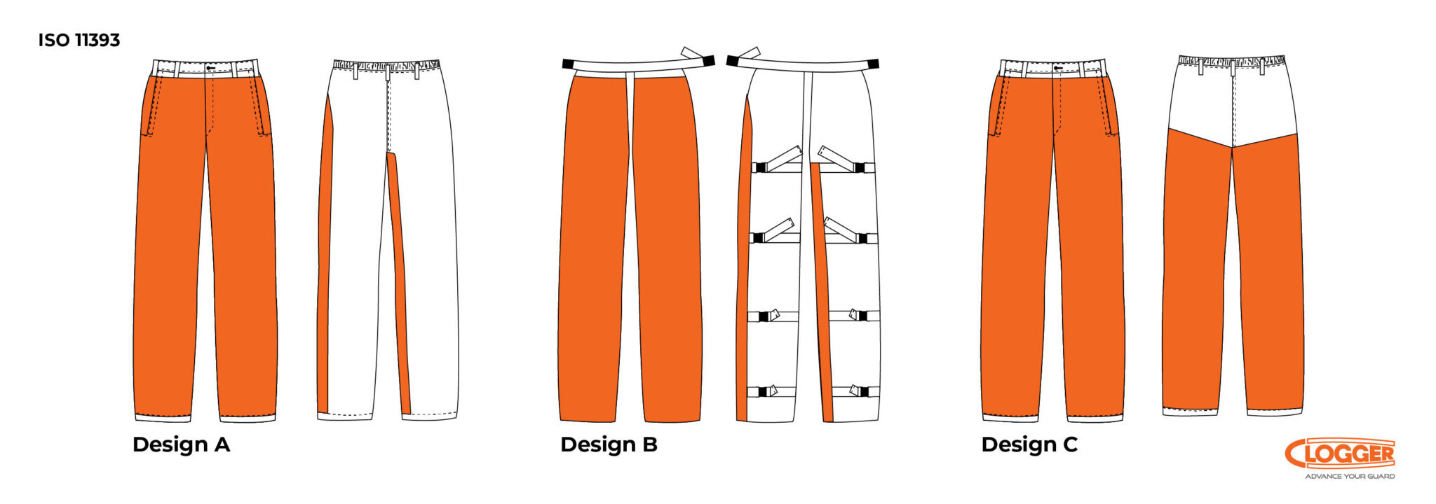 - ISO 11393 outlines the coverage areas for three different designs of leg protectors, Design A trousers – frontal protection; Design B chaps – frontal protection and Design C trousers – frontal and rear protection. AS/NZS4453.3 has adopted Design A only for the trouser style with one very minor modification and its chaps design is similar to Design B. These designs will be looked at closely later.