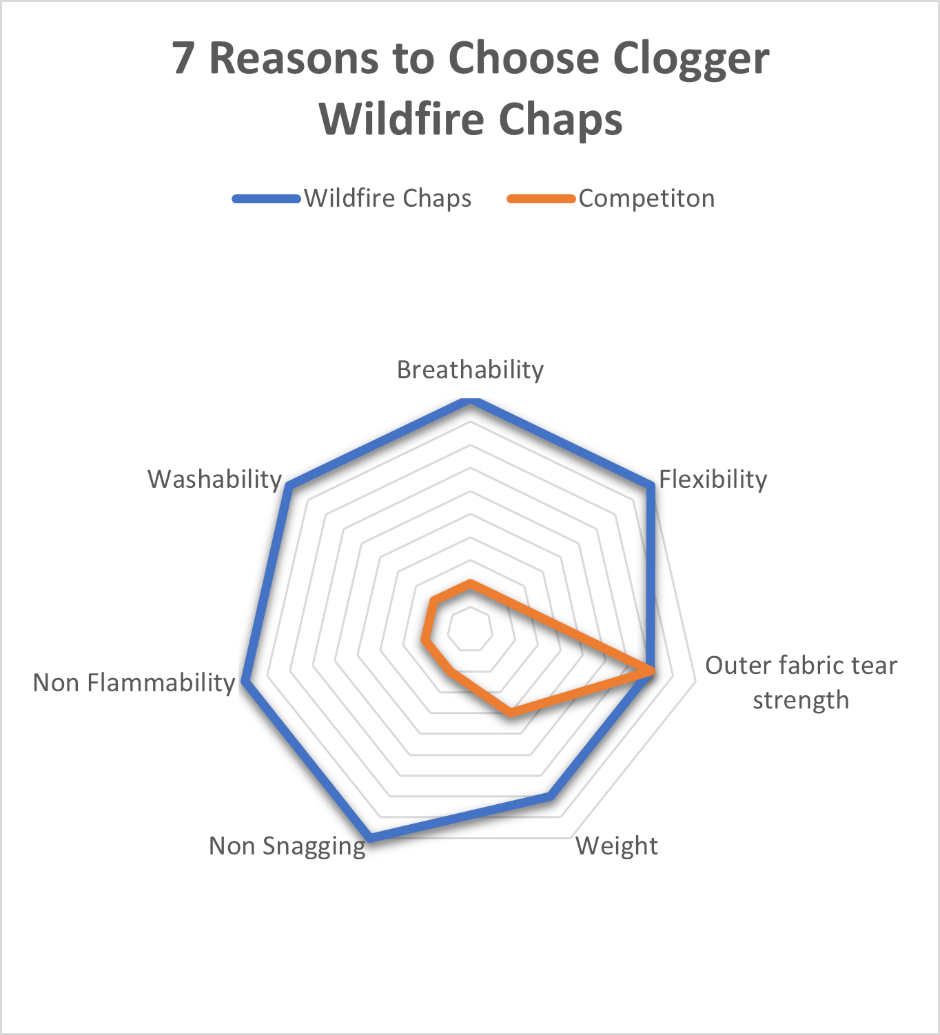 Spider diagram of the Clogger Wildfire benefits in comparison to other makes.